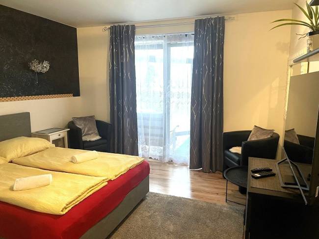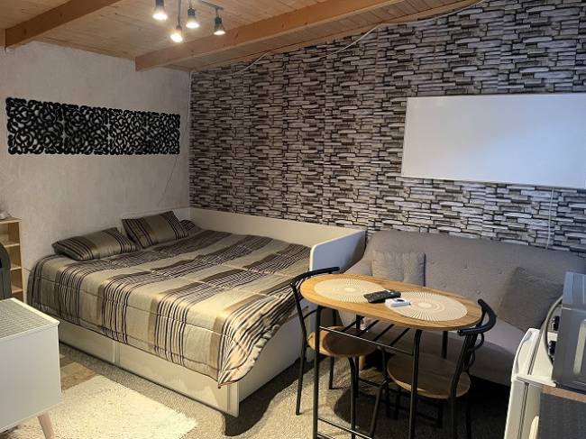 - MALÝ APARTMÁN na prízemí pre 3 osoby : samostatný vchod, vstupná chodba, kuchynský kútik s vybavením a chladničkou, kúpeľňa so sprchou a WC, izba s manželskou posteľou, prísteľkou a vstupom na veľkú prestrešenú terasu