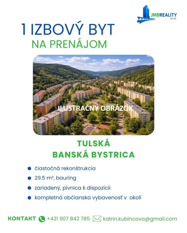 Prenájom 1 izbového bytu (typ bauring) na Tulskej ulici v Banskej Bystrici (Fončorda). Byt je zariadený. K dispozícii je aj pivnica.