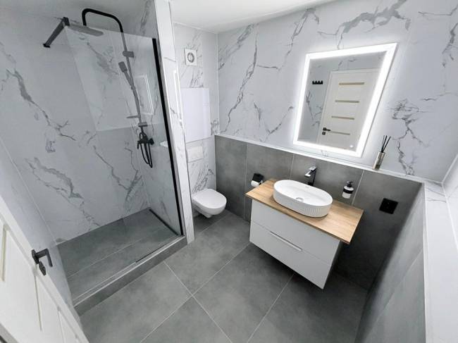 • priestrannú kúpeľňu s použitím nadštandardných materiálov – veľkoformátový obklad a dlažba, sprchový kút, WC Geberit