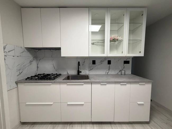 • kuchynskú linku na mieru so zabudovanými spotrebičmi: umývačka riadu, chladnička s mrazničkou, elektrická rúra, zabudovaná mikrovlnná rúra, digestor, moderný drez a 4-horáková plynová varná doska